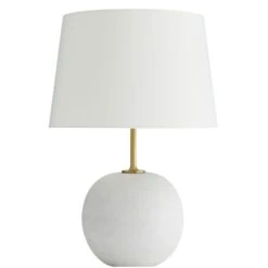 Presenting a polished but modest profile Colton exceeds expectations with refined materials and sophisticated style. An exaggerated antique brass stem reveals an oversized white orb foundation composed of rice stone. A functional art piece in its simplest form for traditional and modern settings.