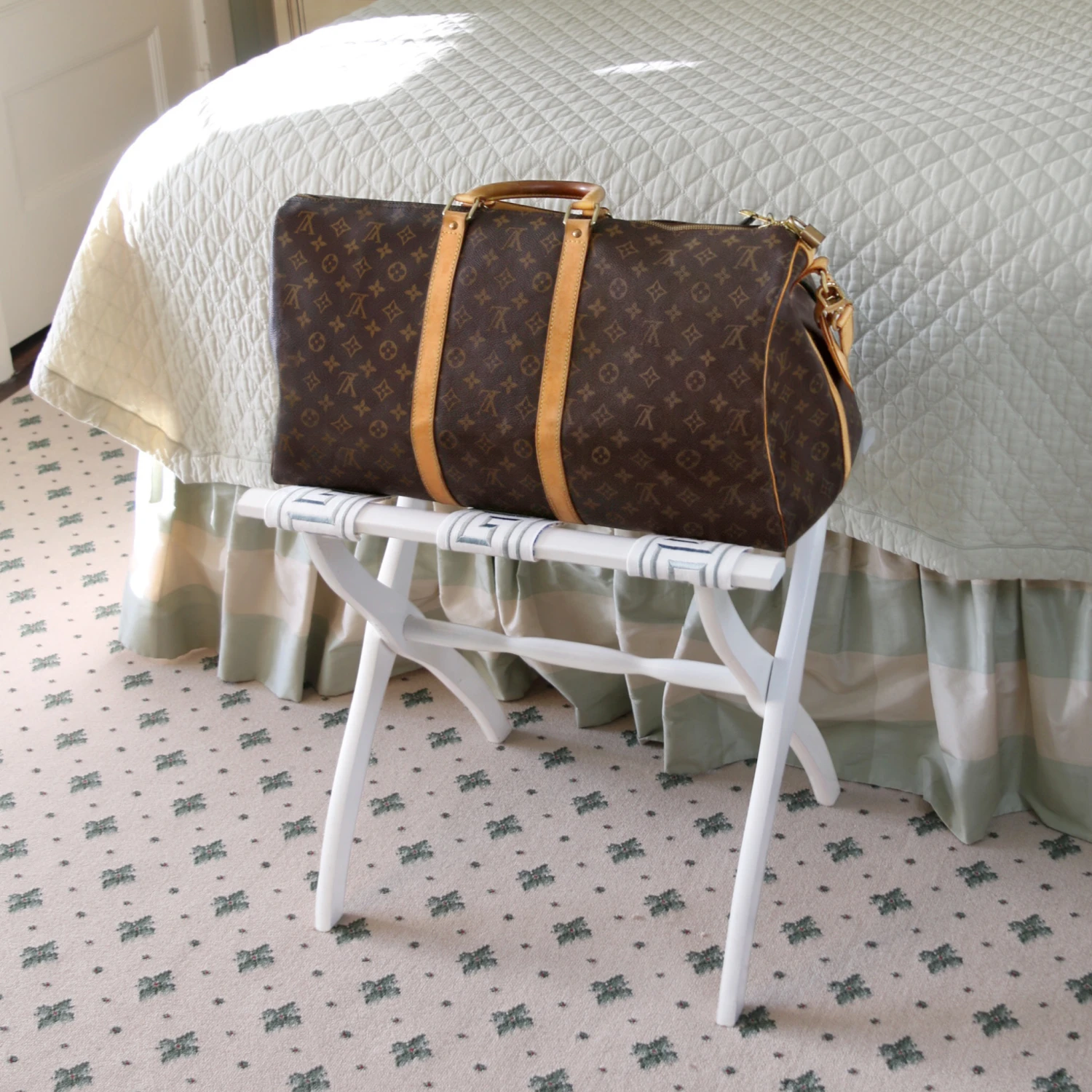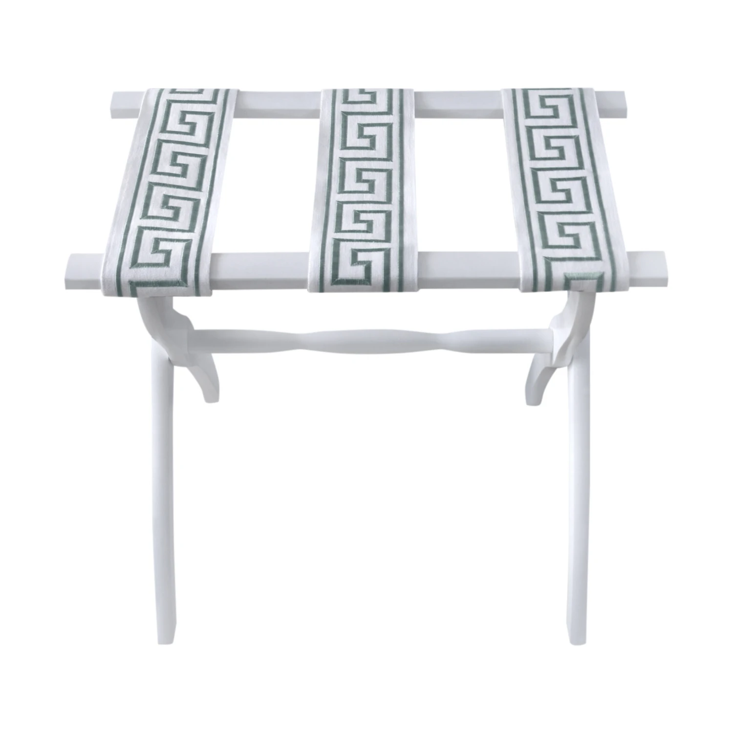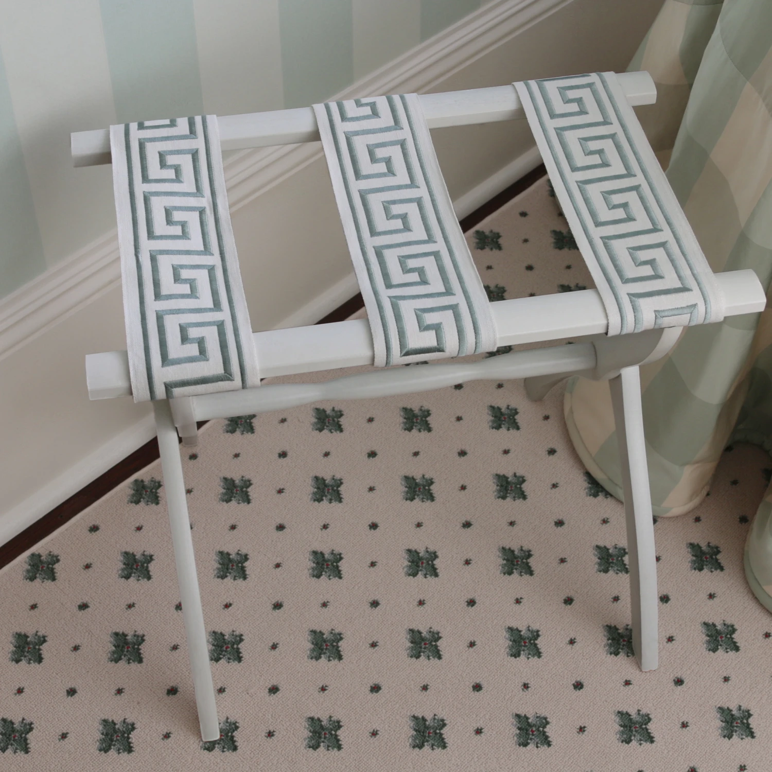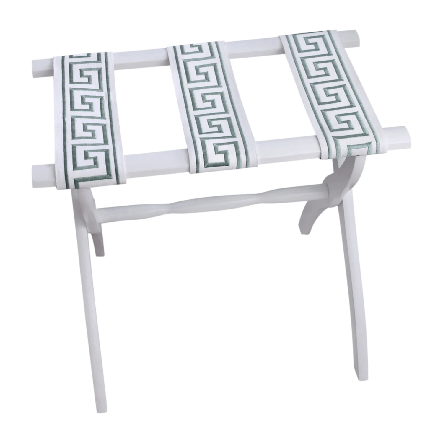 This Contour Leg Luggage Rack boasts a striking Light Sage Green Greek Key 4″ Trim, adding a touch of refined luxury to your travel experience. Its unique contour leg design provides sturdy support for your luggage, making it both functional and elegant. The perfect addition to your high-end travel collections.