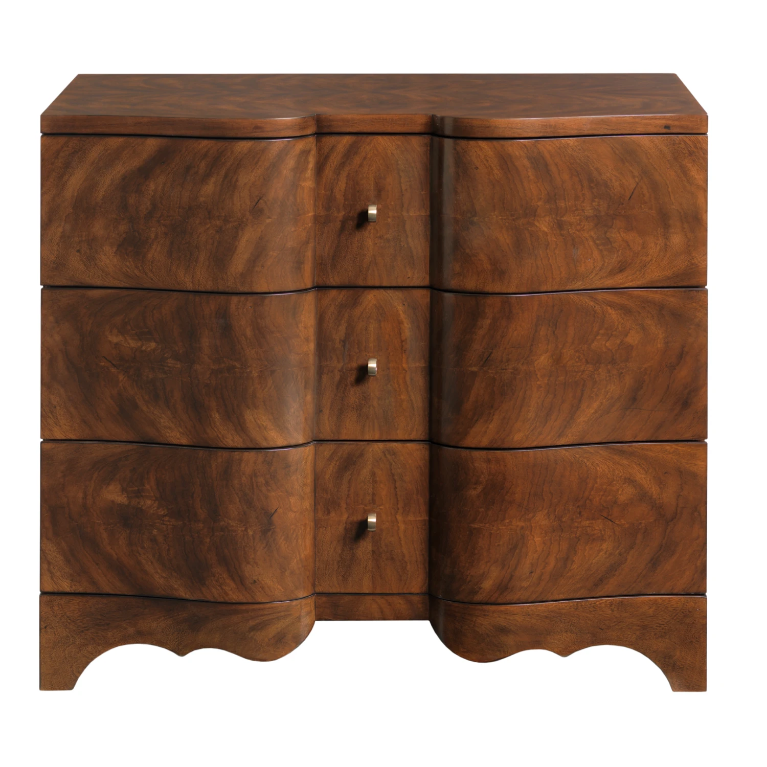 A terrific chest for bedside with a shaped front of three individual drawers over a scalloped base.