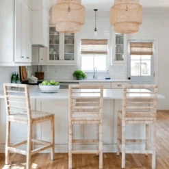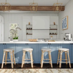 Mahogany Wood And Rattan Counter Chair With Natural Colored Cushion