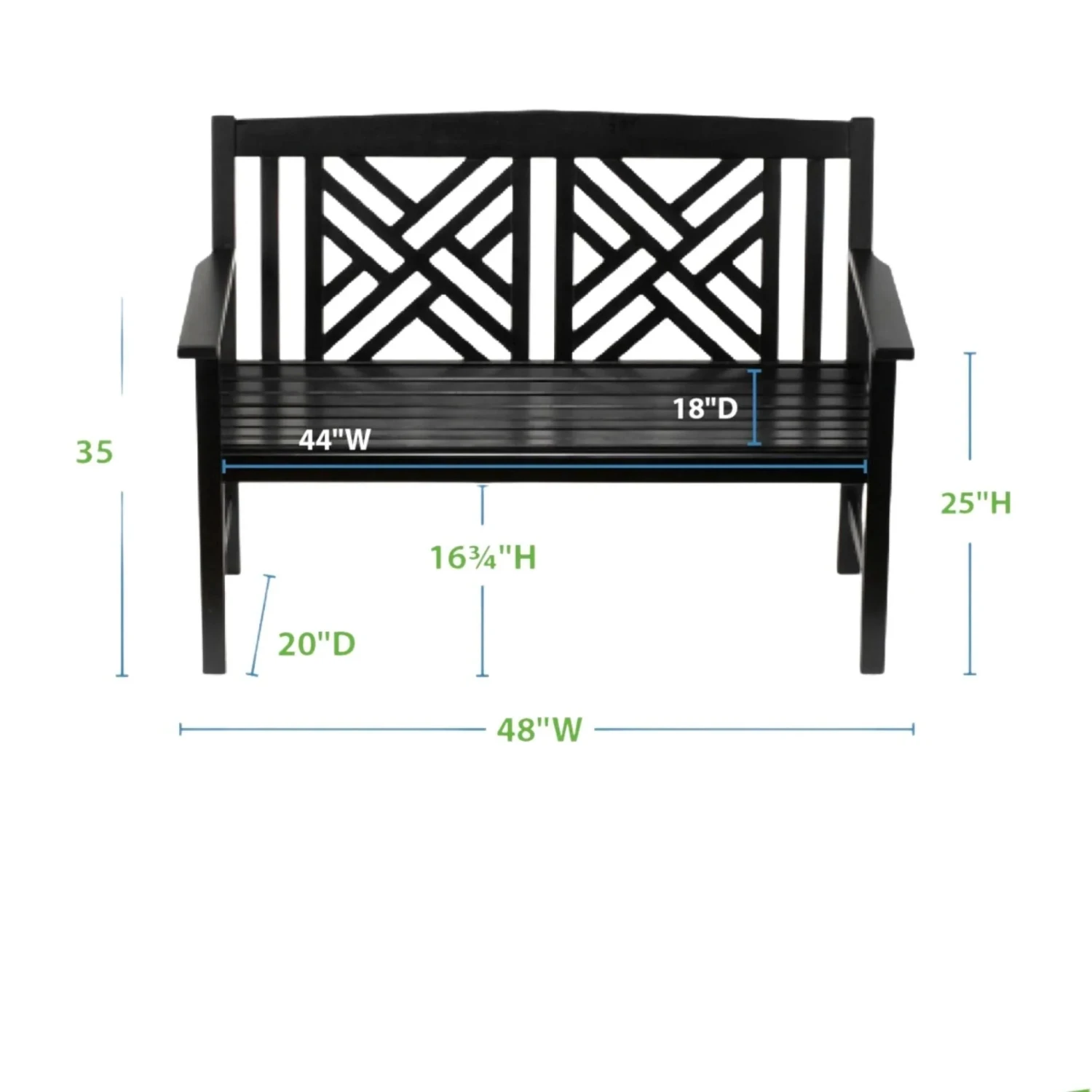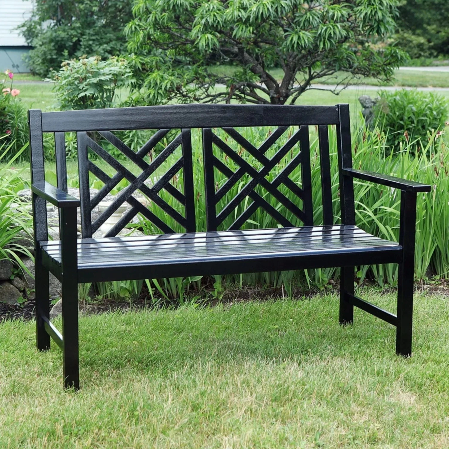 The elegant Fretwork Outdoor Wooden Bench has a classic English garden style with a lattice-work backrest, slatted seat, and straight armrests. The Fretwork Outdoor Wooden Bench is striking against colorful foliage and flowers. Enjoy a comfortable resting place, bird-watching, or conversation in the garden. The attractive gloss black lets this bench blend well with indoor décor as well, for casual seating, or an occasional bench in a playroom, mudroom, or hall.