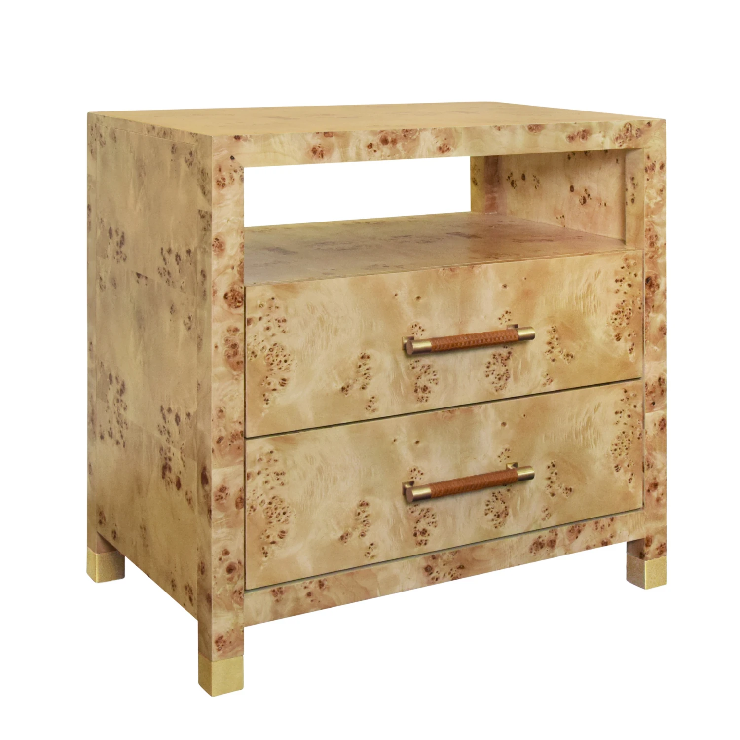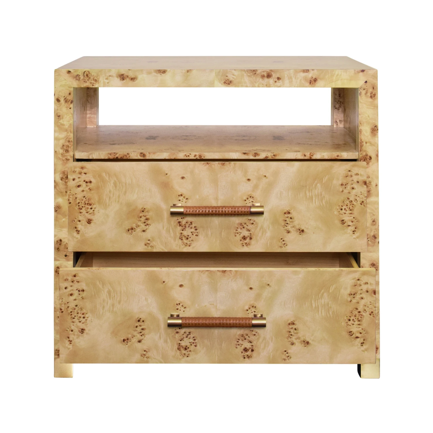 Introduce sophistication to your bedroom with the Hancock Nightstand. Crafted with burl wood and rattan-wrapped handles, this two-drawer side table exudes luxury. Its elegant design adds a touch of art and fashion to your space. Organize and elevate your bedside essentials with ease.