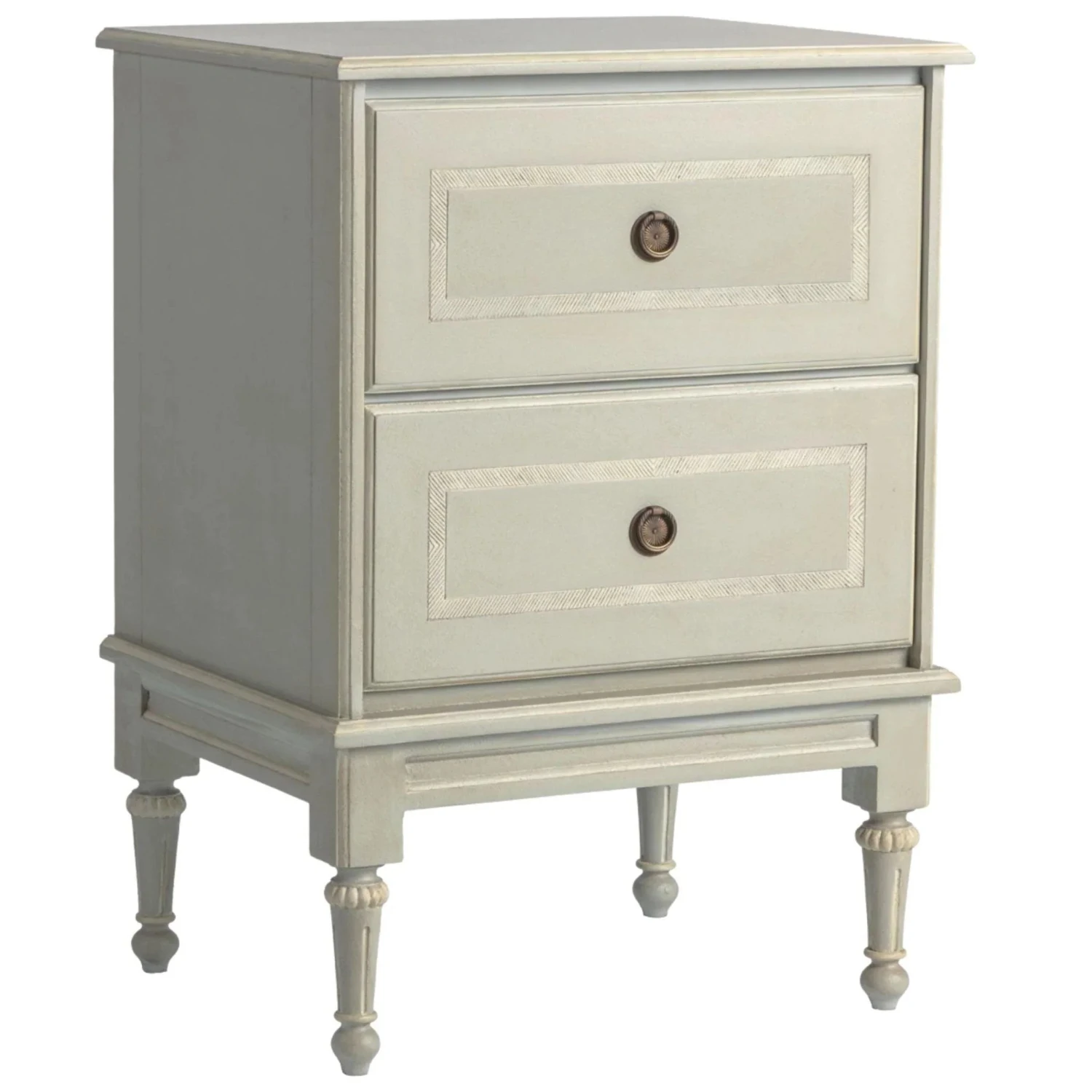 This elegantly handcrafted Antique Grey Two Drawer Chest makes a great end table or nightstand.