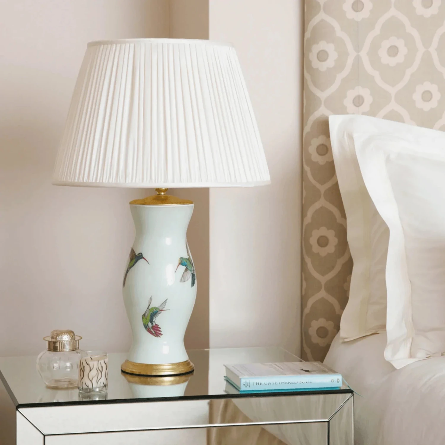 Add a special touch to your room with this handmade in England designer lamp. The lamp features hummingbird design. Hummingbirds are optimistic little birds, seen as healers and bringers of love. Designed to have small variants of every colour, to fit in with most color schemes. Perfect as bedside lamps.