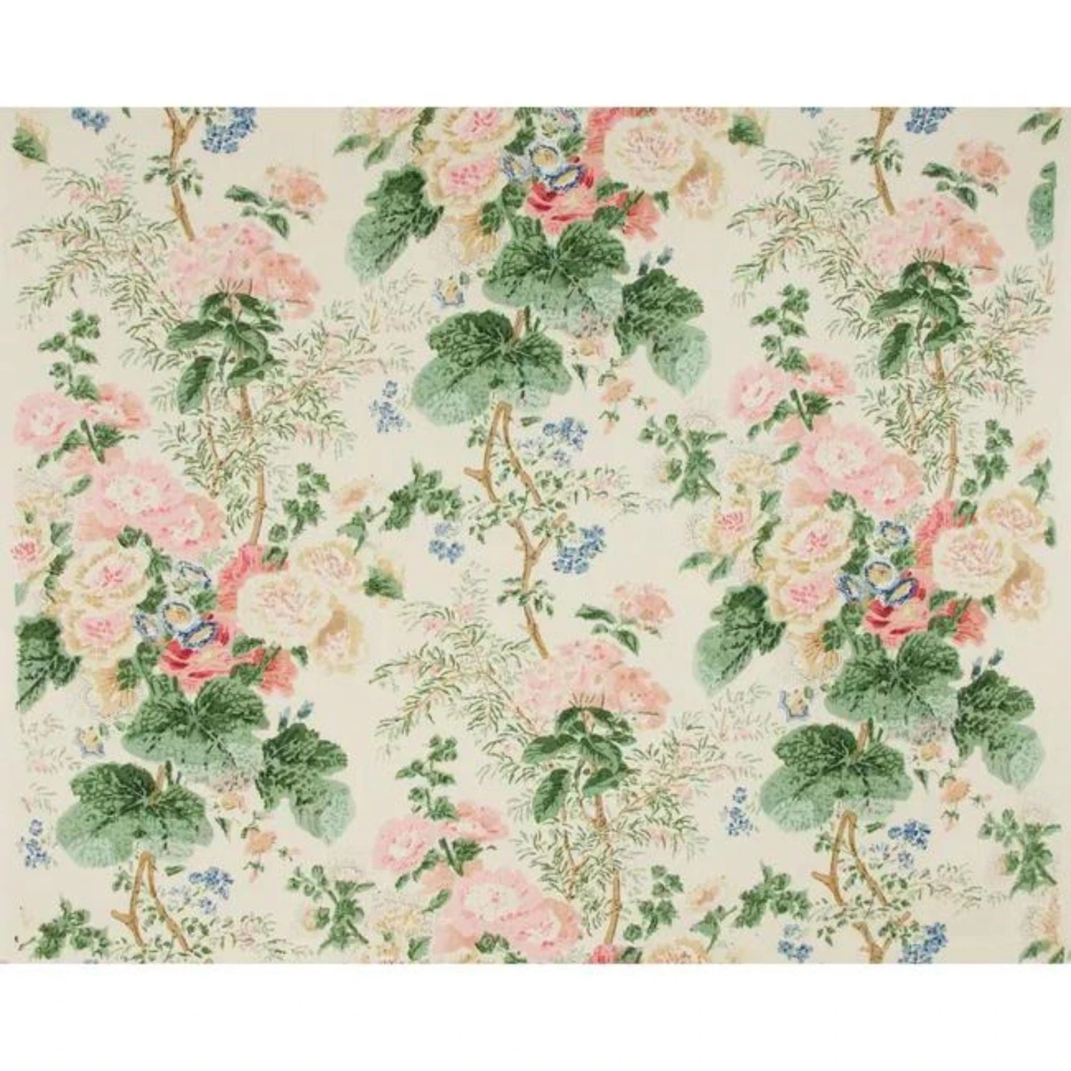 This lovely fabric features hollyhock pattern in white and coral. Please note the fabric is sold by the yard. This item is cut from a die lot upon order and may not be returned.