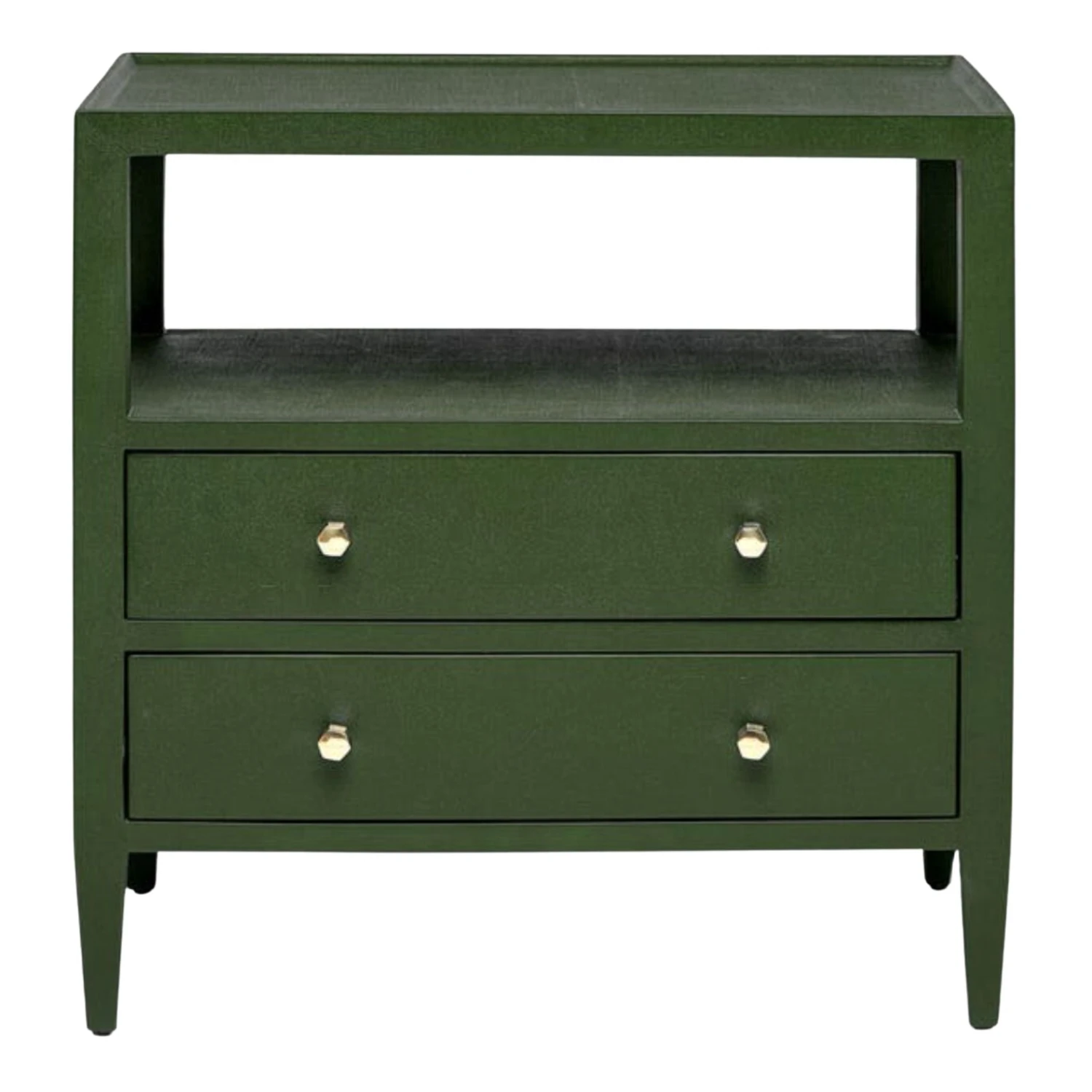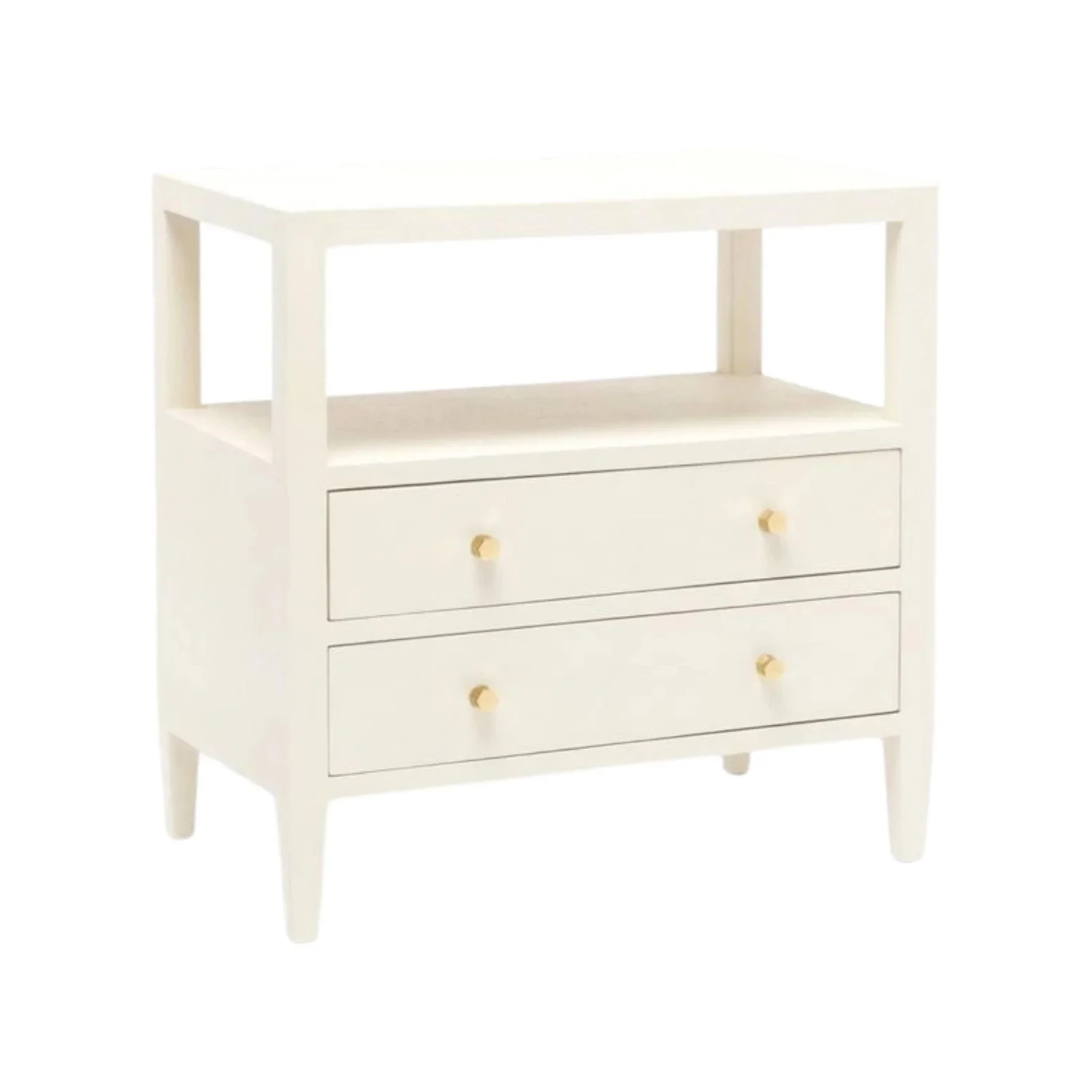 The Jarin’s classic nightstand is fully finished in faux Belgian linen. This simple, rectangular piece highlights the material’s texture and sheen. An open-air shelf lightens up the nightstand’s silhouette; two drawers offer storage and tapered legs create an elegant finish.