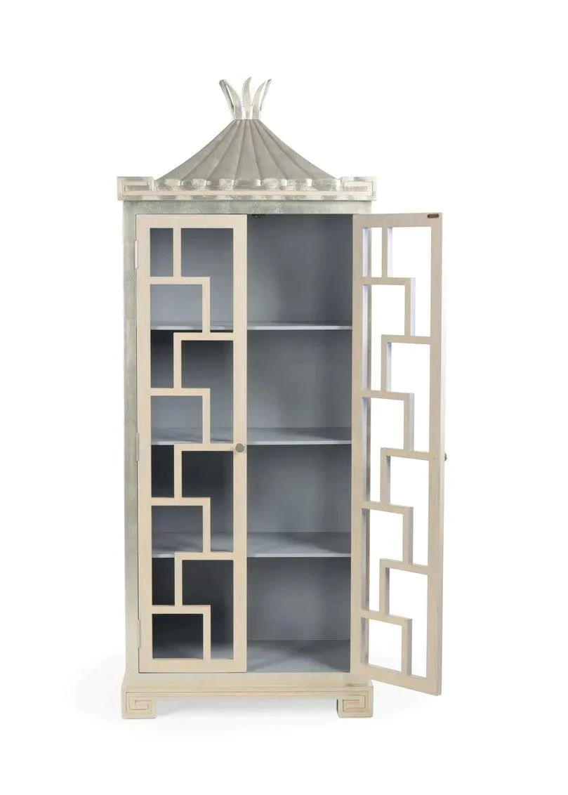 This beautiful fretted cabinet features a limed oak finish, gray interior, silver leaf accents, and clear glass. This piece is not intended for clothes storage.