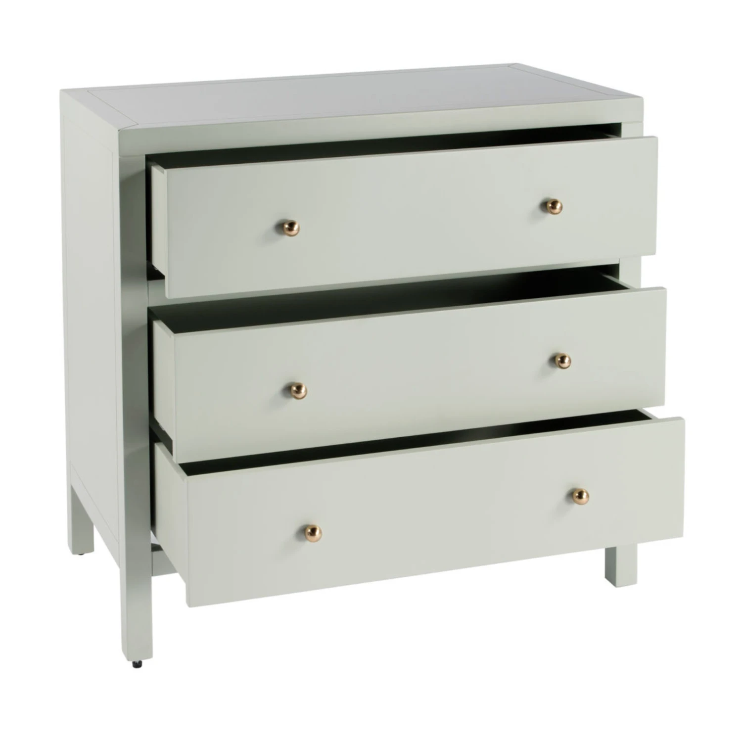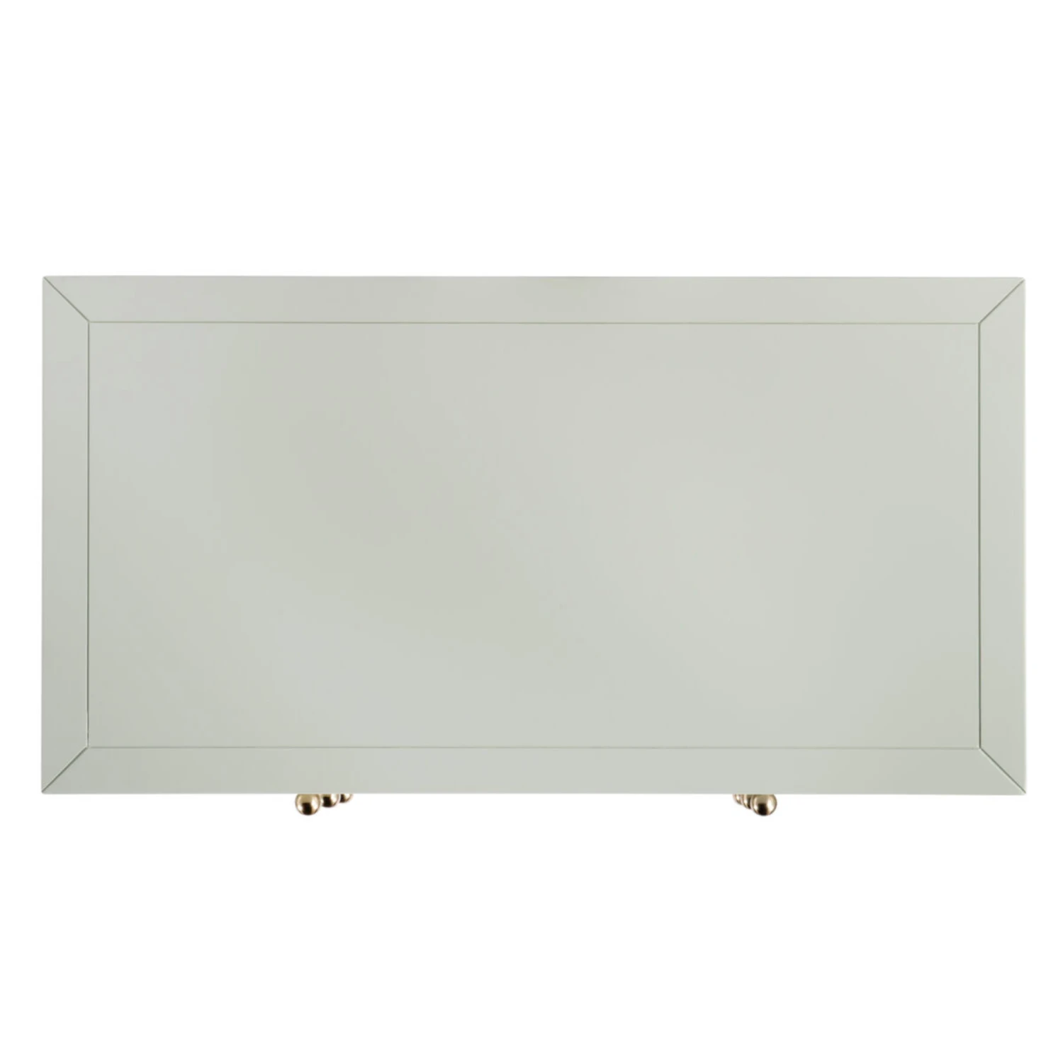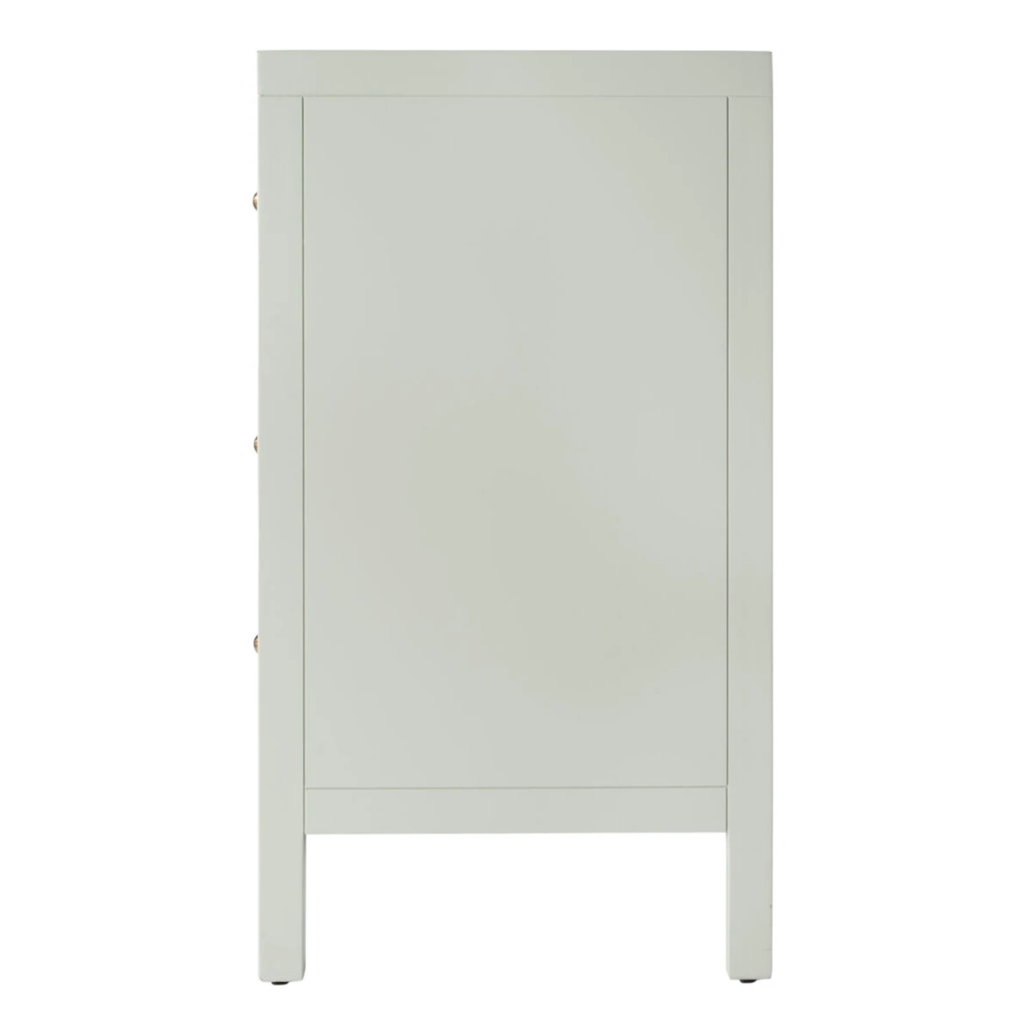 The color is smooth sage green, exceptionally built using acacia wood, acacia veneer, MDF and pine wood construction. Designed with durability and style in mind, featuring a solid Acacia wood frame complemented by Acacia veneer top and side panels over engineered wood, which adds structural integrity while maintaining a natural look. The drawers, made of solid pine with Acacia wood fronts, are crafted with tongue and groove joinery for stability. Equipped with undermount drawer glides and soft-close functionality, each drawer extends by 0.75 inches for easy access and a smooth, quiet operation. The kiln-dried wood construction minimizes warping, and a scratch and stain-resistant lacquer preserves its finish, making it ideal for both residential and commercial spaces. Removable antimony hardware adds a classic touch, while plastic floor protectors guard against scuffs, ensuring the piece remains functional and attractive over time. Shape is rectangular with 4 legs