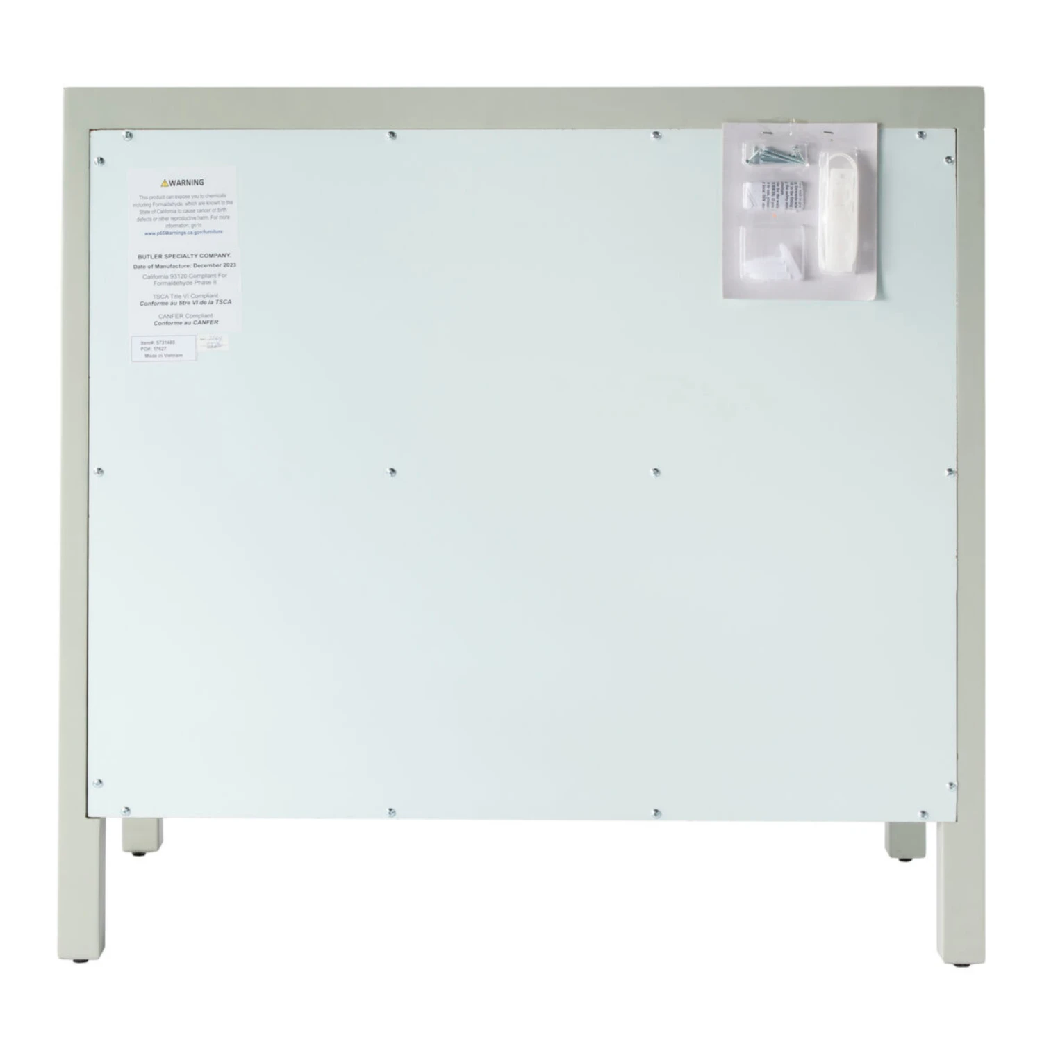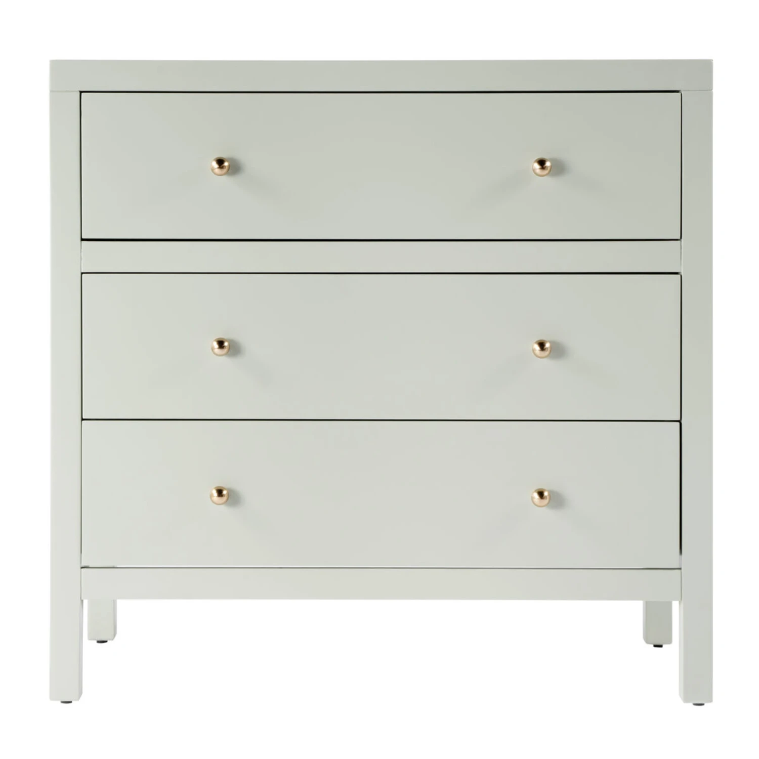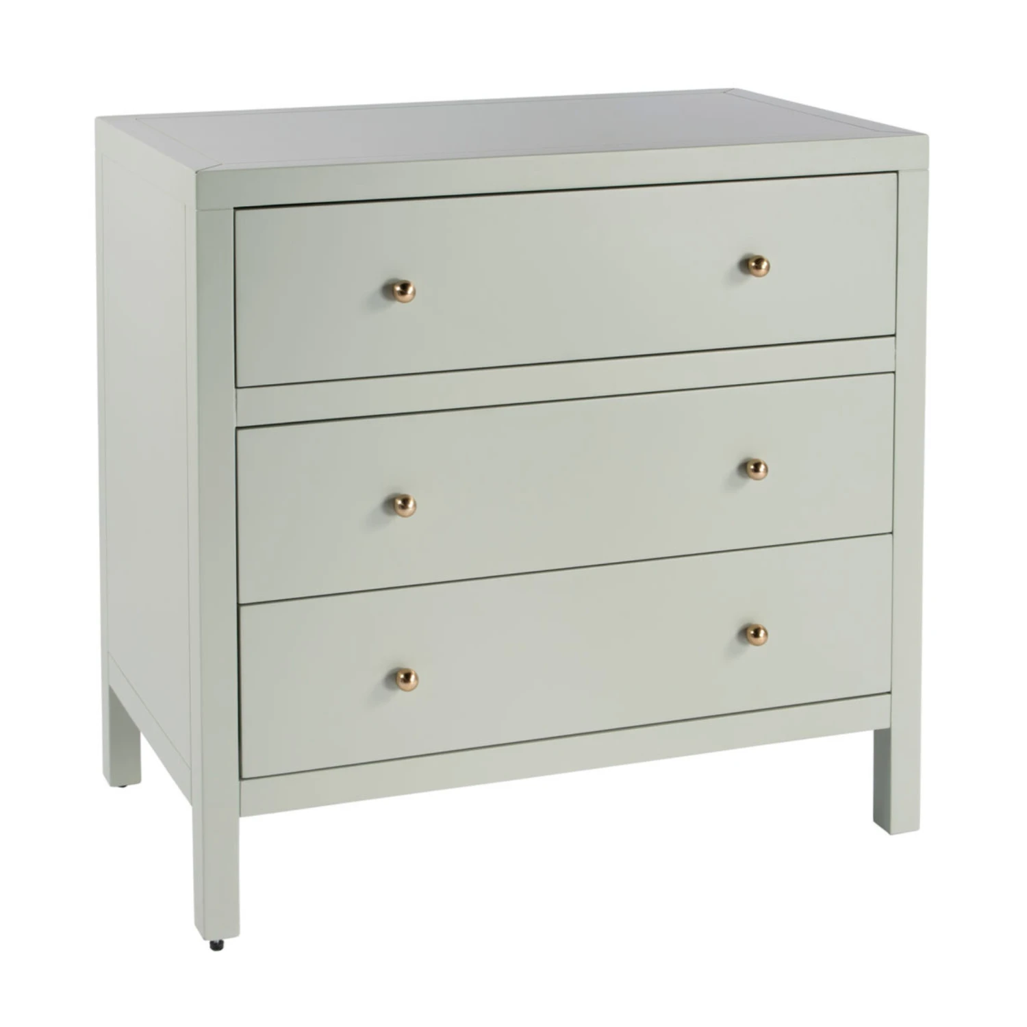 The color is smooth sage green, exceptionally built using acacia wood, acacia veneer, MDF and pine wood construction. Designed with durability and style in mind, featuring a solid Acacia wood frame complemented by Acacia veneer top and side panels over engineered wood, which adds structural integrity while maintaining a natural look. The drawers, made of solid pine with Acacia wood fronts, are crafted with tongue and groove joinery for stability. Equipped with undermount drawer glides and soft-close functionality, each drawer extends by 0.75 inches for easy access and a smooth, quiet operation. The kiln-dried wood construction minimizes warping, and a scratch and stain-resistant lacquer preserves its finish, making it ideal for both residential and commercial spaces. Removable antimony hardware adds a classic touch, while plastic floor protectors guard against scuffs, ensuring the piece remains functional and attractive over time. Shape is rectangular with 4 legs