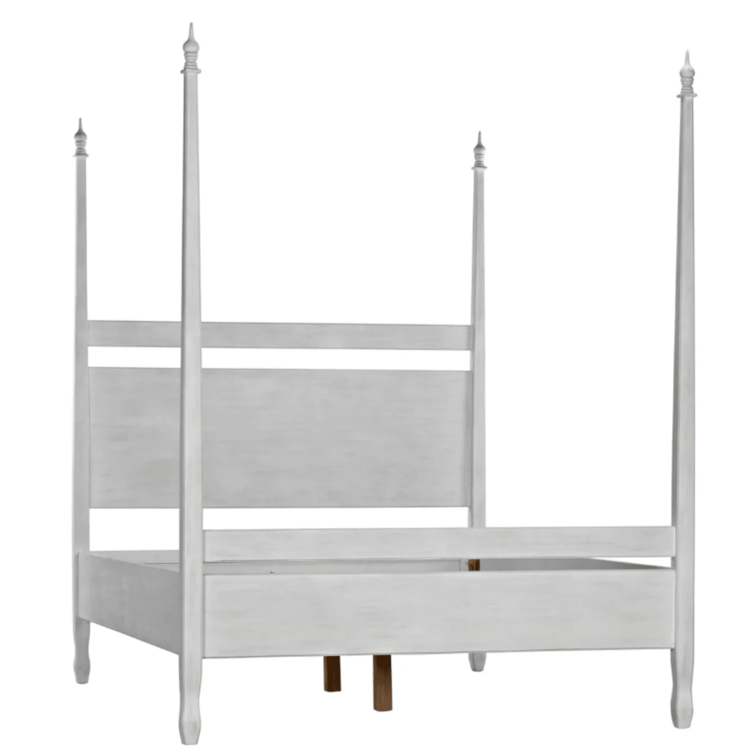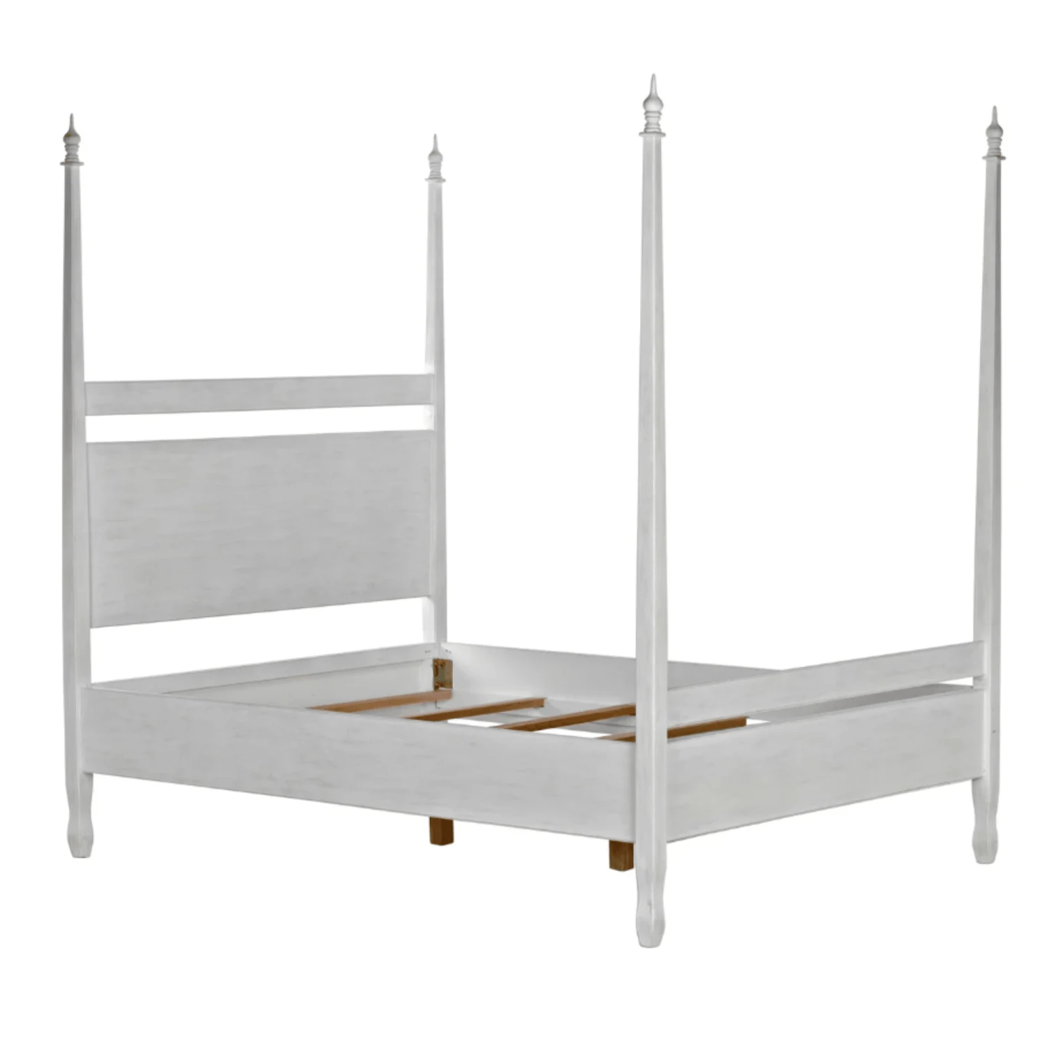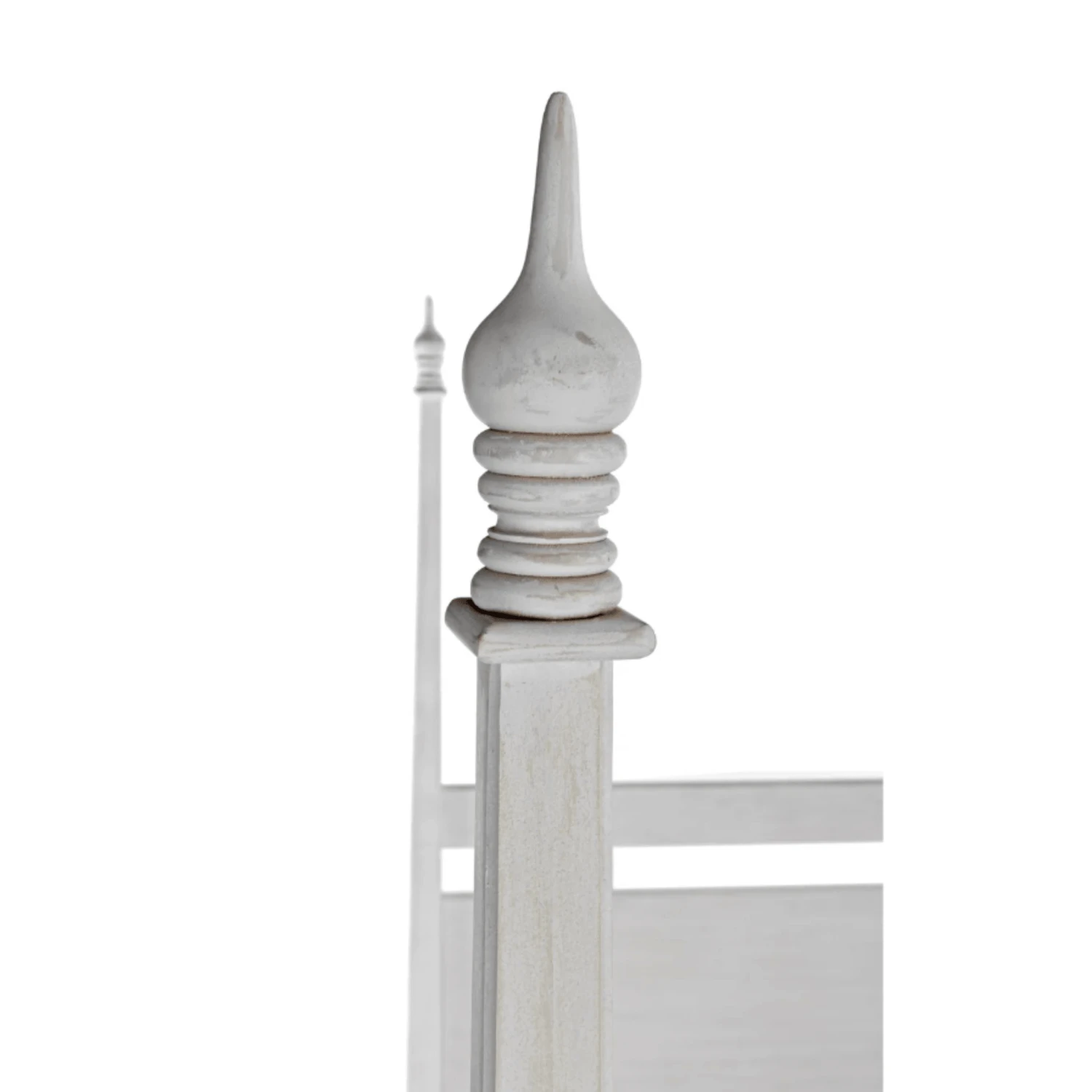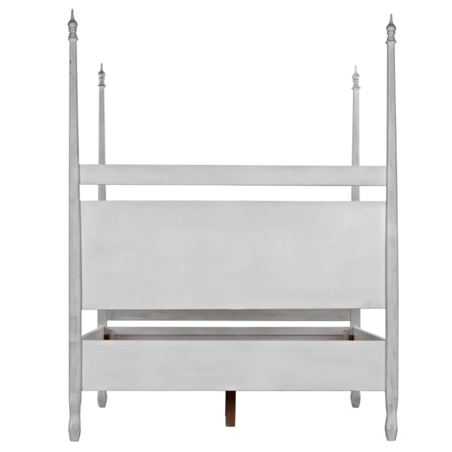 Hand-carved of solid mahogany, this four poster queen bed features a hand applied white wash finish. Lay back and admire the handcarved decorative finials and feet. Click images for greater detail.