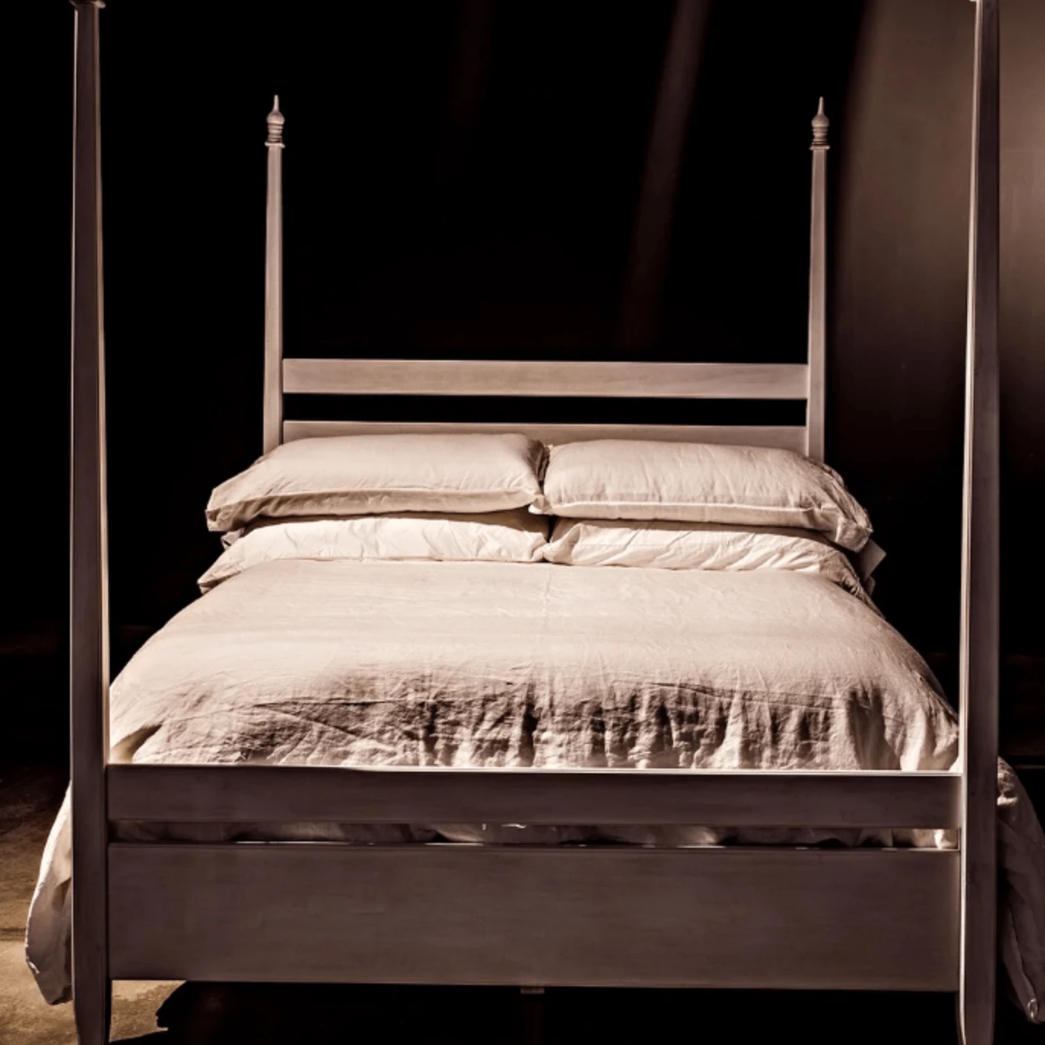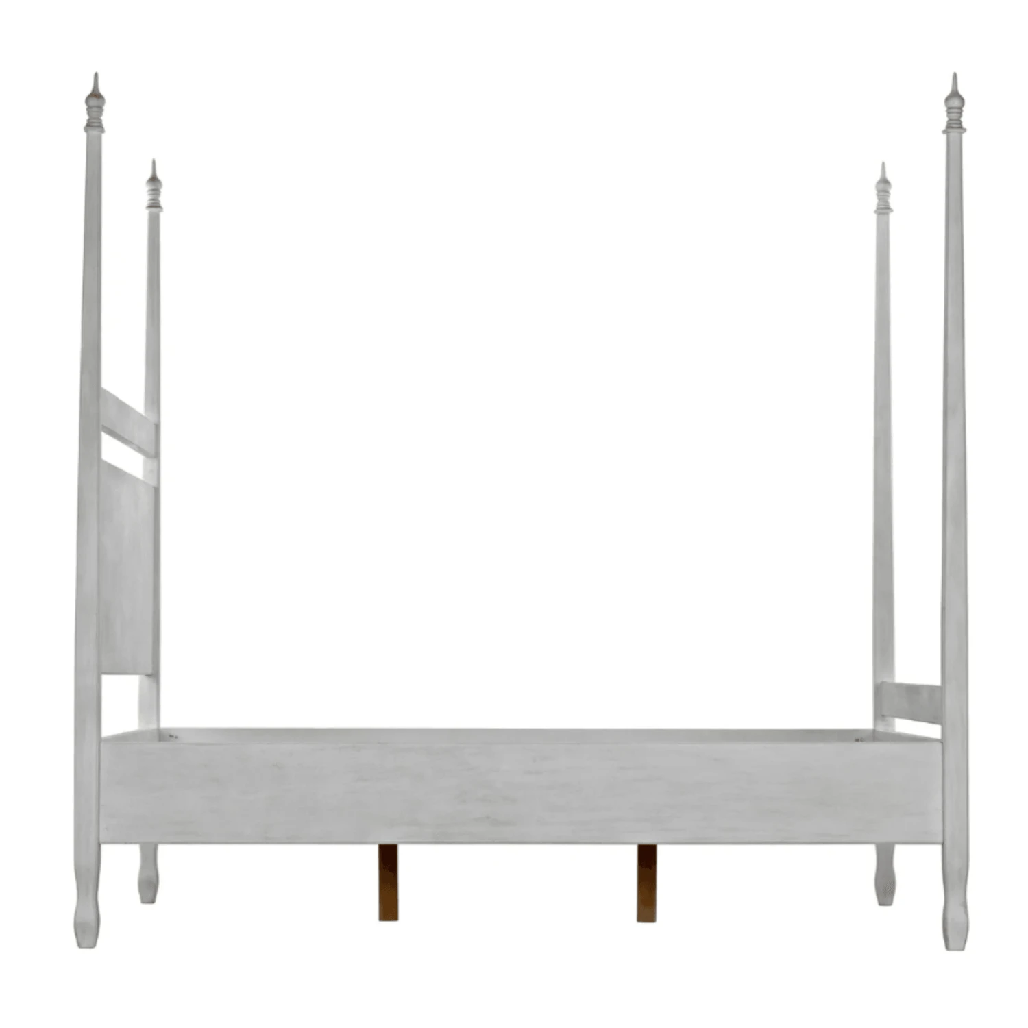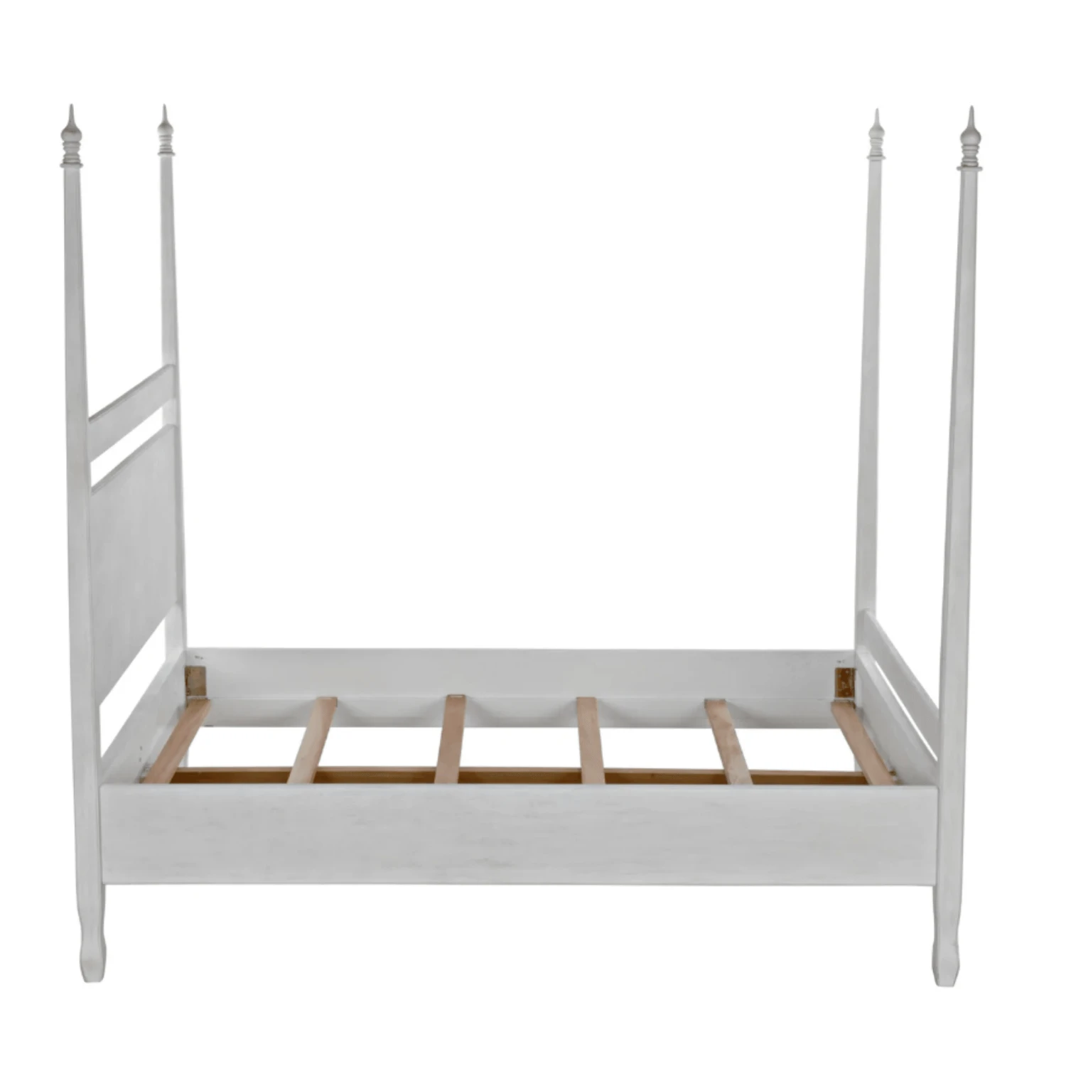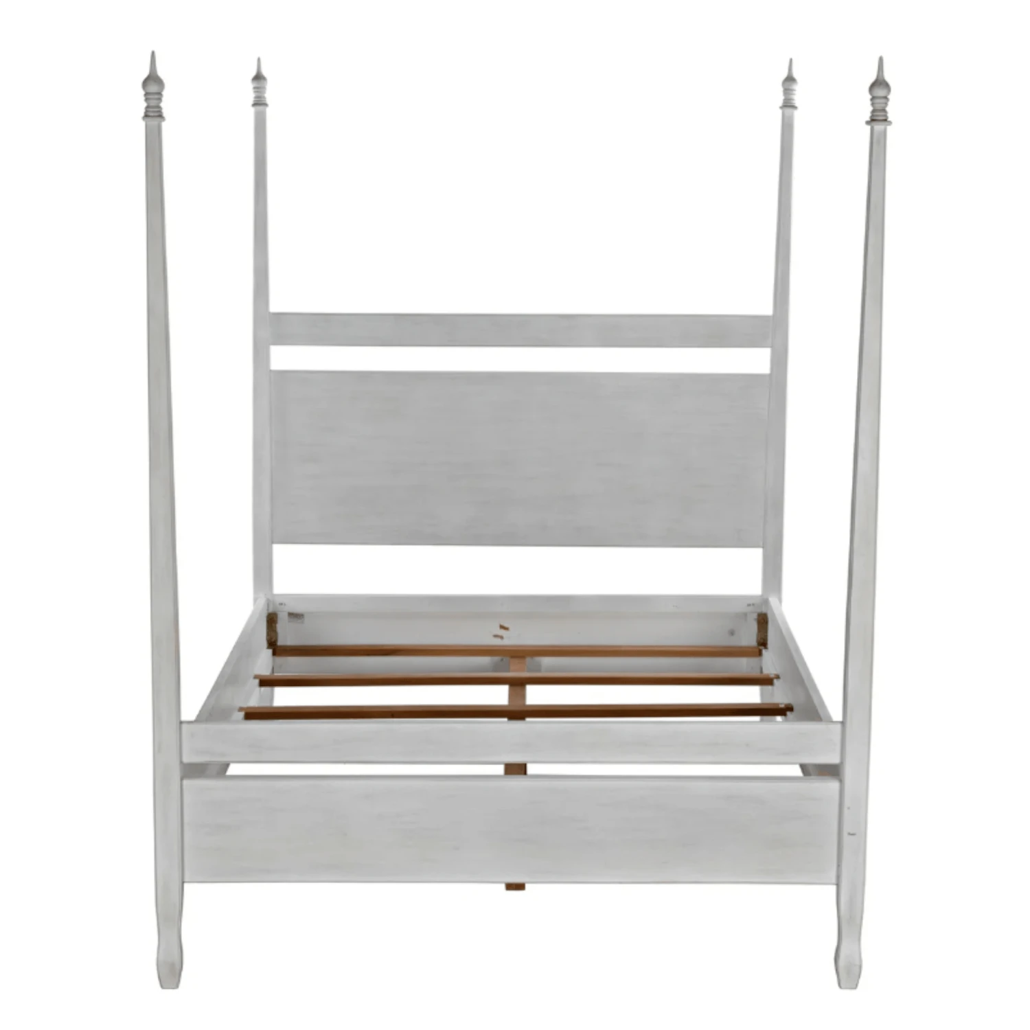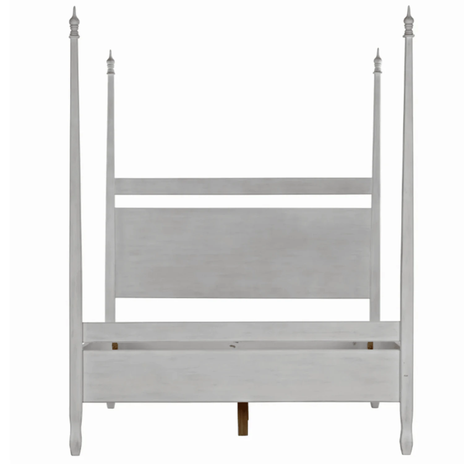 Hand-carved of solid mahogany, this four poster queen bed features a hand applied white wash finish. Lay back and admire the handcarved decorative finials and feet. Click images for greater detail.