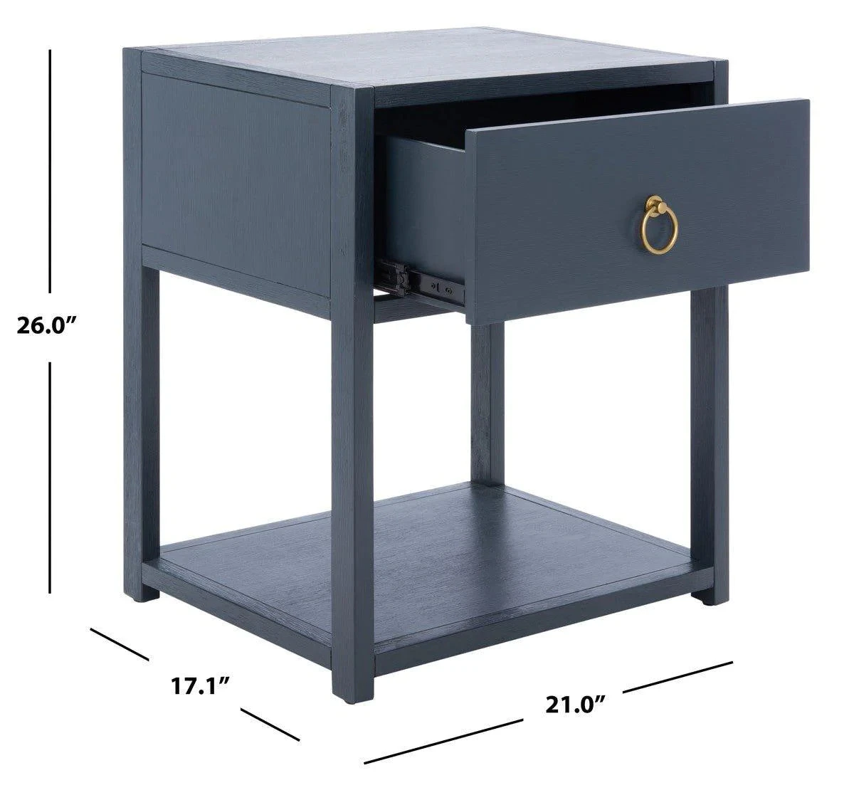 This nightstand is ideal for today’s décor smart bedrooms with its classic silhouette and contemporary chic style. The bold navy finish on the acacia wood frame beautifully highlights the gold pull on its drawer, while a bottom shelf provides ample space for books, magazines, or accessories.
